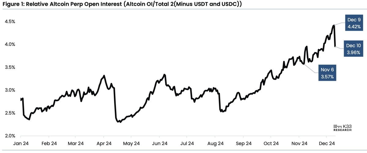 "Yesterday's altcoin leverage wipeout was potentially the largest daily long liquidation event since May 19, 2021, and liquidations saw altcoin leverage fall by $12.8 billion, the largest daily reduction in altcoin open interest ever," K33 Head of Research Vetle Lunde said in a report on Tuesday. "We note that cascading liquidations were a frequent feature of the 2021 bull market and are seemingly back on the menu as we near the end of 2024."