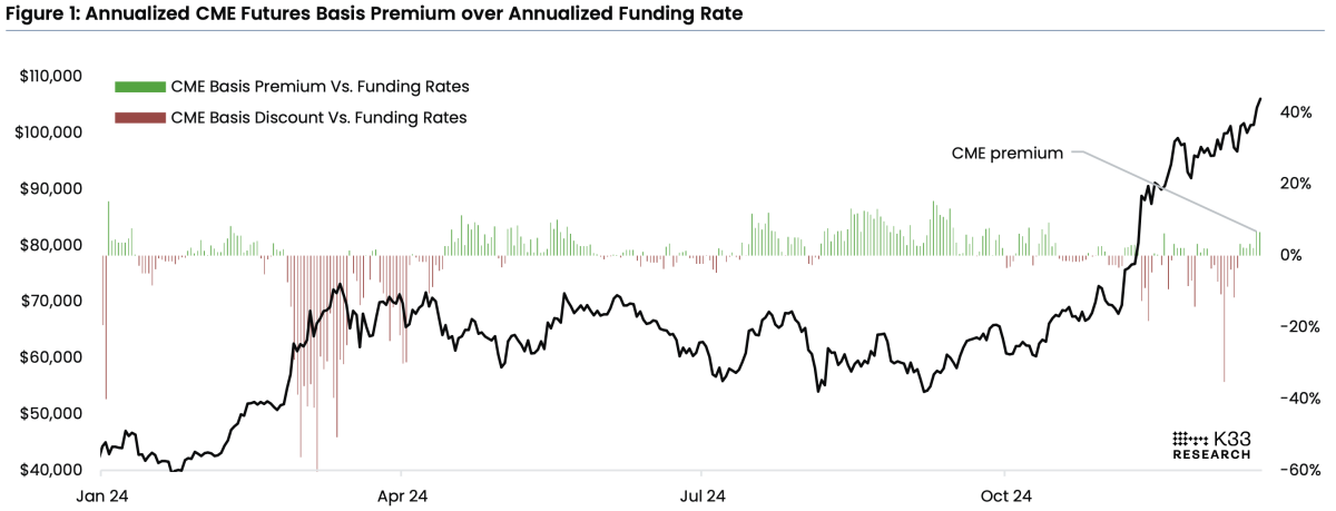 The CME basis premium for bitcoin futures has increased over the past days. Image: K33 Research