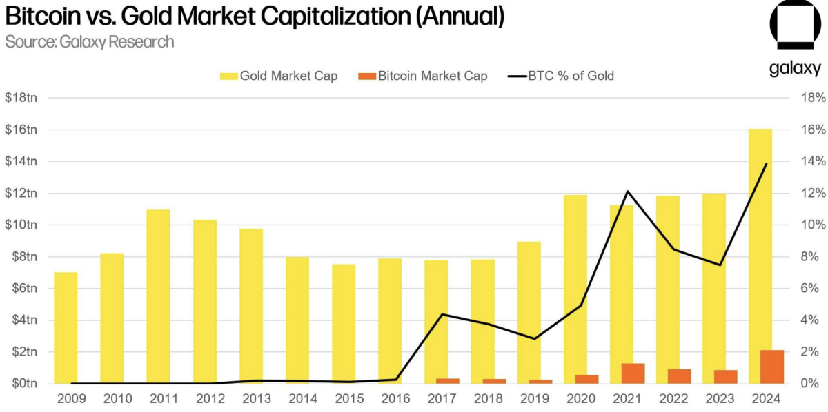 Bitcoin’s market cap has reached a new all-time high against gold's market cap, now at 14%, according to data from Galaxy Research.