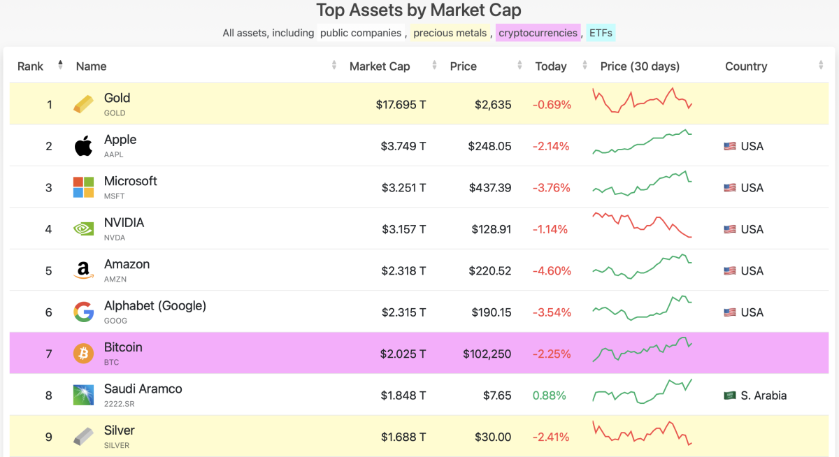Bitcoin’s market capitalization has surpassed $2 trillion, ranking it seventh among global assets by market cap, according to data from CompaniesMarketCap.com. This puts bitcoin ahead of Saudi Aramco and silver in the rankings, further solidifying its position as a major asset class.
