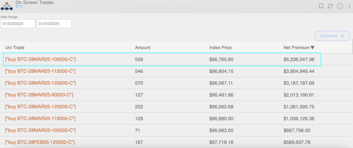 A $6 million premium was paid for bitcoin calls at a strike price of $100,000 for the end-of-March expiry. Image: Amberdata.
