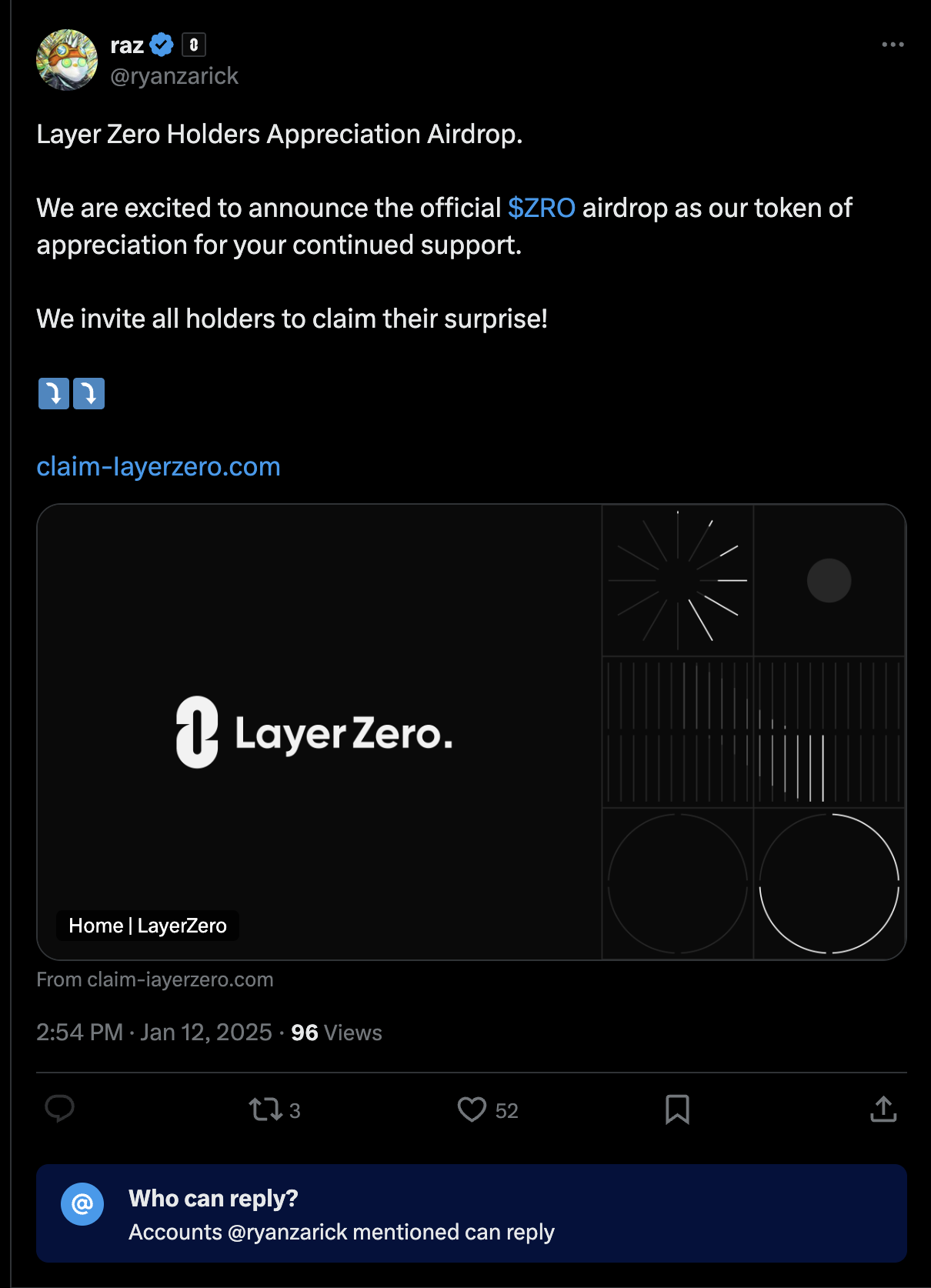 Scam posts, such as the above, generally entice users with promises of a newly-launched memecoin or airdrop, and restrict replies to prevent users from calling out the scam. Though account owners often regain control of the account quickly, some fast-moving crypto traders often fall victim to the scheme.