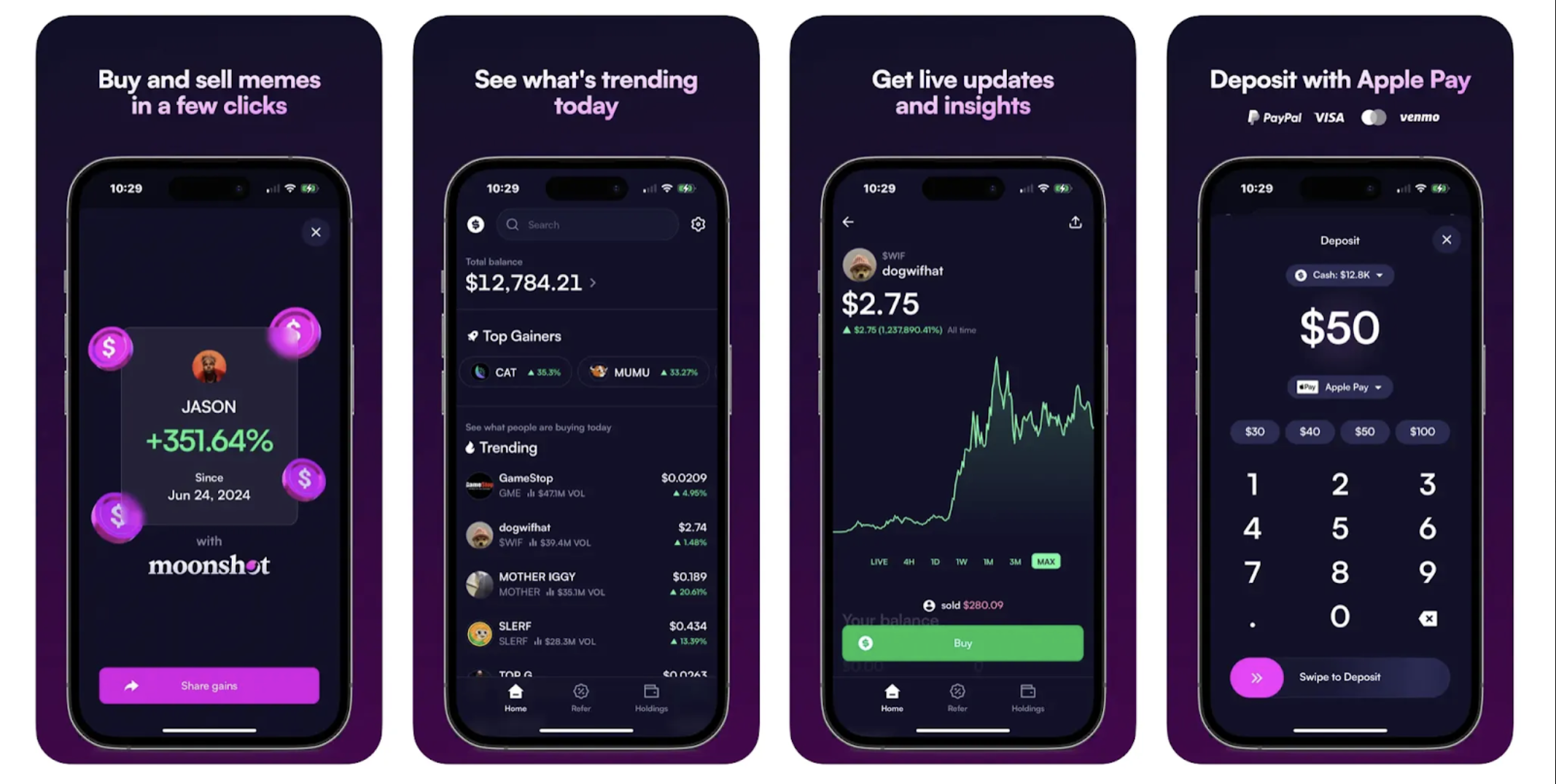 Moonshot is a trading platform that allows users to buy and sell meme tokens via methods like Apple Pay. Key features include: