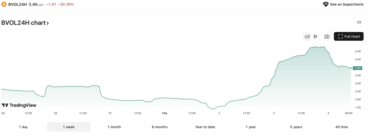 Bitcoin historical volatility over the past week shows a sharp increase on Monday. Image: TradingView.