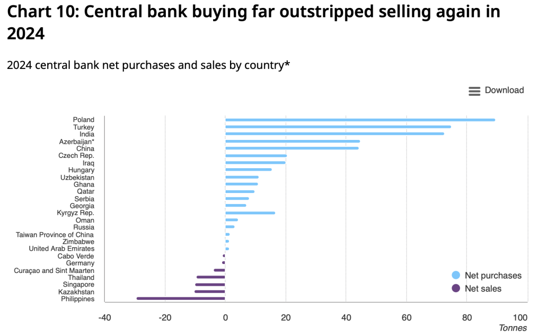 Among the largest gold buyers in 2024 were Poland, India, Turkey and China, with net purchases of 89.5 tons, 72.6 tons, 74.8 tons, and 44.2 tons respectively. Western sanctions on Russia’s central bank reserves in 2022 have been cited as a turning point, reinforcing gold’s role as a geopolitical hedge.
