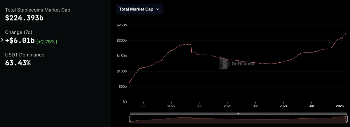 Total stablecoin market cap has reached an all-time high. Image: DeFi Llama.