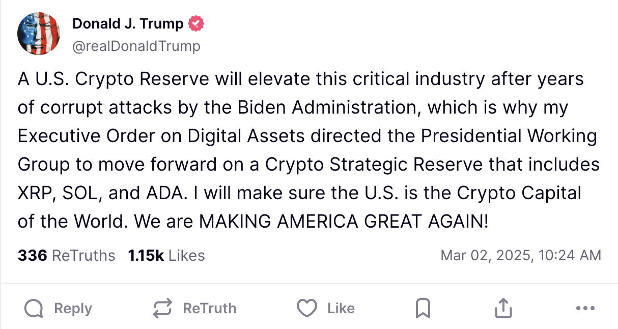 - President Trump, on Truth Social, directed his crypto working group to “move forward” on a Crypto Strategic Reserve that includes SOL, XRP, and ADA.