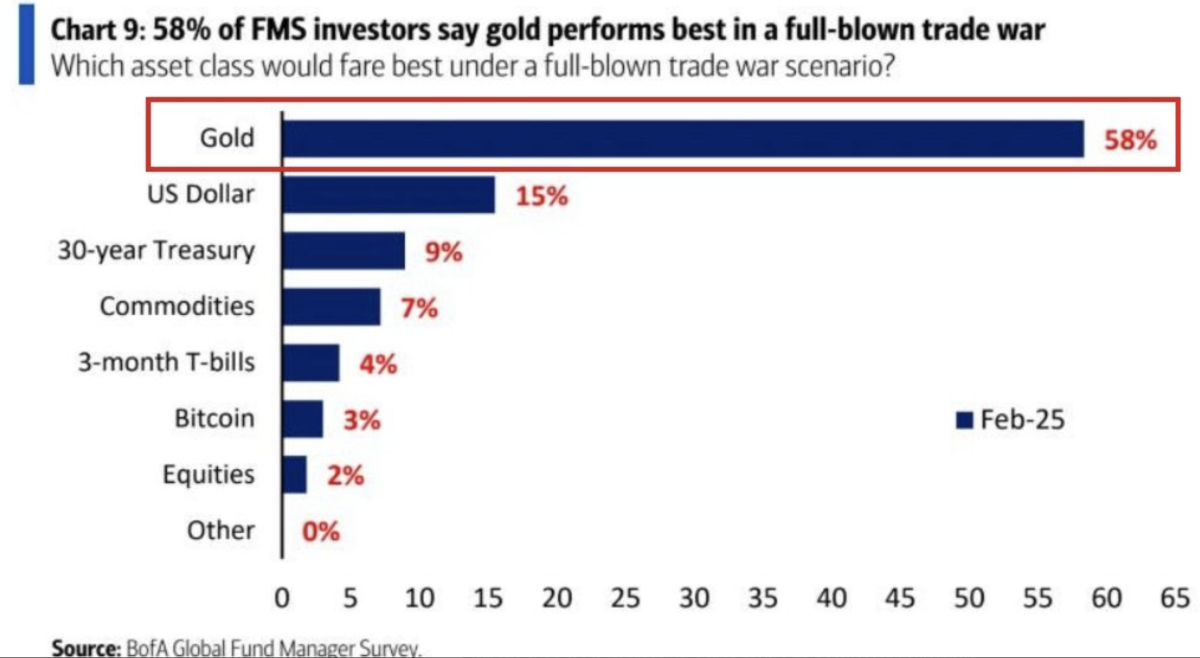 Gold will perform best in a global trade war. Image: Bank of America Global Fund Manager Survey.