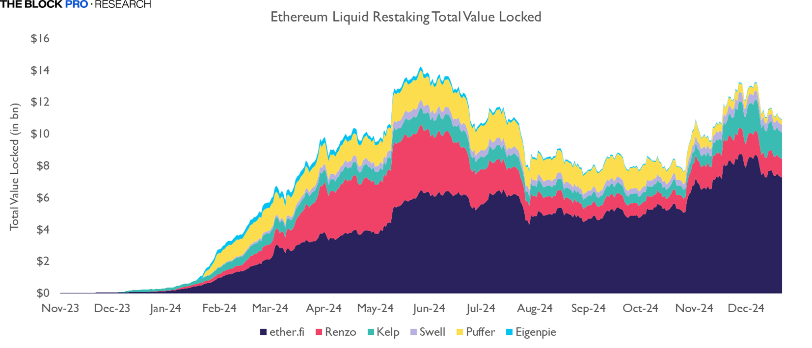 As of 31 December 2024, the total value locked (TVL) in the top 6 liquid restaking protocols on Ethereum stood at $11B.