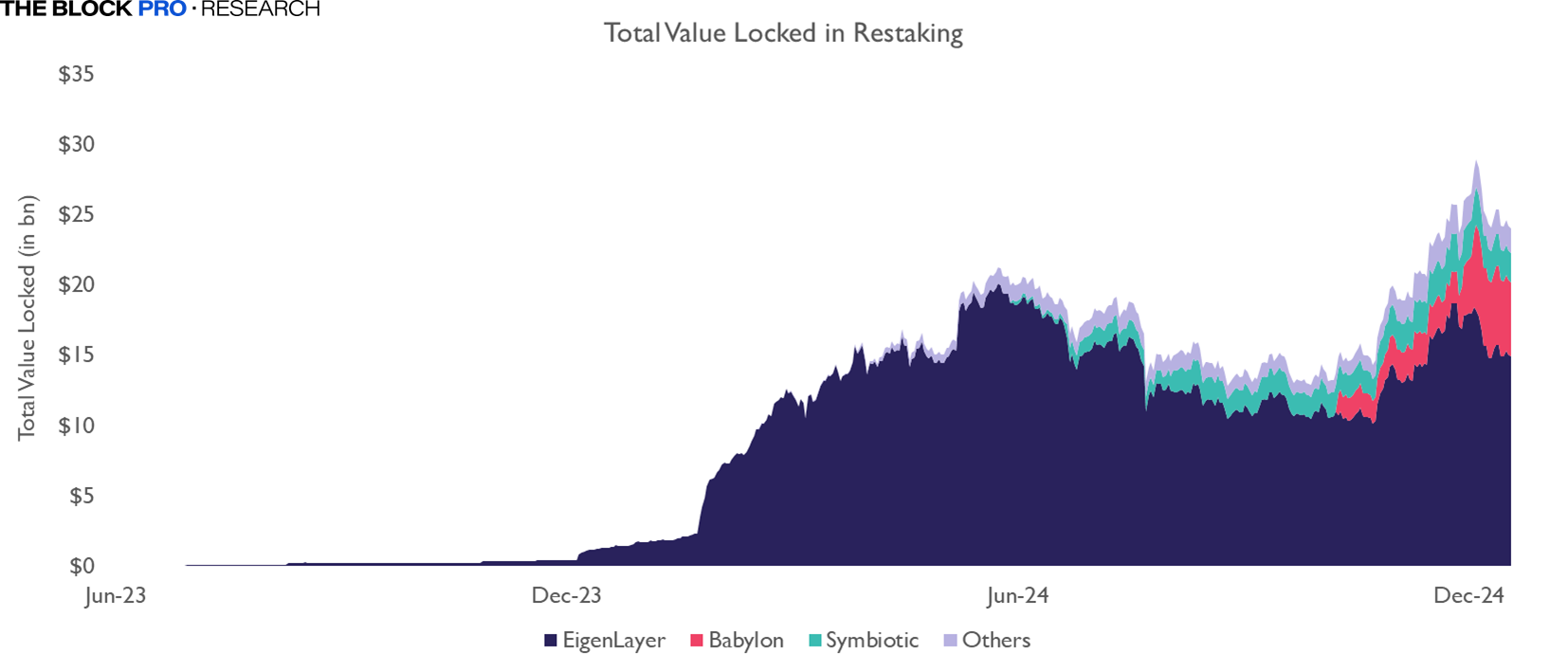As of 31 December 2024, the total value locked (TVL) in restaking across all blockchains stood at $24.7B.