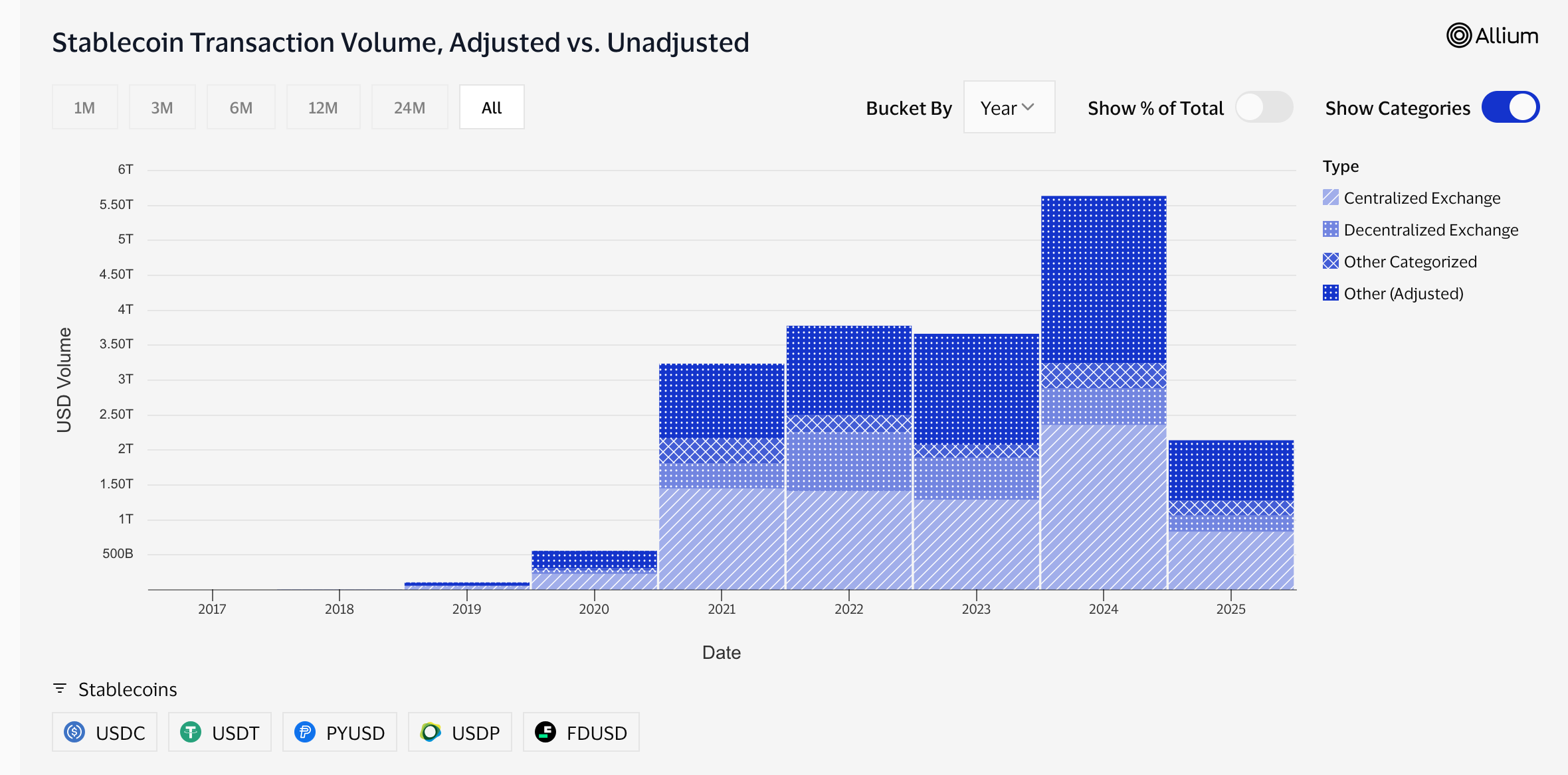 Stablecoins saw their biggest year yet in 2024, moving over $5.5 trillion in adjusted volume across more than 1.2 billion transactions, according to Visa's onchain dashboard. That momentum hasn't faded: in just the first few months of 2025, adjusted volume has already crossed $2 trillion, with over 300 million transactions recorded. If that pace holds, 2025 is on track to surpass last year's total, potentially hitting $6 trillion in volume by year-end. These figures use Visa's adjusted methodology, which filters out bots, exchange rebalancing and high-frequency noise to reflect real economic usage. The trend is clear — stablecoins aren't retreating; they're becoming routine.