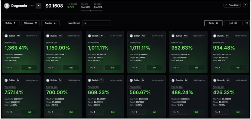 The image shows a one‐click “strategy explorer” where each “card” or tile corresponds to a particular options strategy on Dogecoin. Rather than diving into complicated option chain data, you get a clean, visual lineup of different bullish, bearish, or sideways strategies. Each card highlights the type of strategy (bullish/bearish/sideways), the potential return if you’re right, and a quick way to “pay and place” that bet. By presenting strategies in a side‐by‐side format, it makes it easy to compare potential outcomes, trade‐offs, and expiry dates all at a glance. This streamlines what would normally be a time‐consuming process—piecing together multiple options legs manually—and turns it into a straightforward click‐to‐select flow.