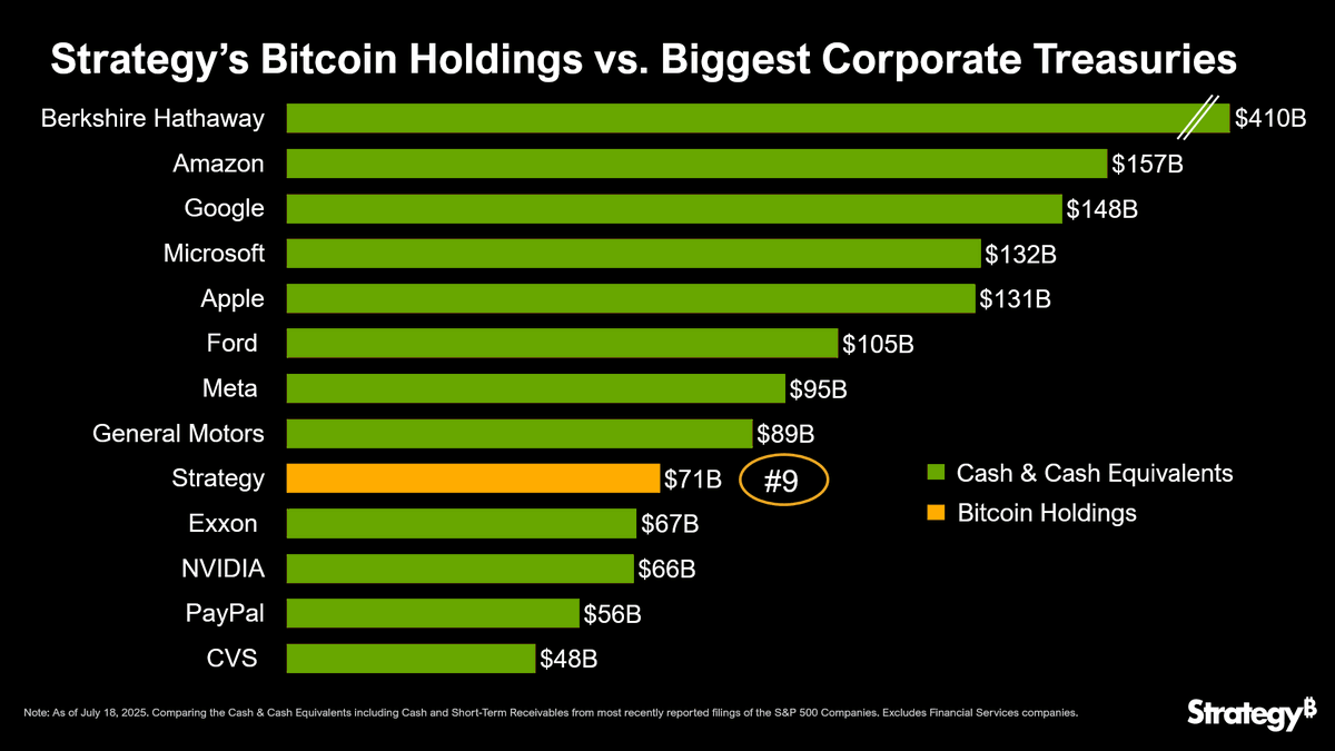 A bar chart the company released last week shows its BTC hoard would place ninth if stacked against the cash-and-cash-equivalent positions of blue-chip giants such as Berkshire Hathaway, Amazon, and Alphabet, just behind General Motors’ $89 billion and ahead of ExxonMobil’s $67 billion. The data illustrates how a once‑niche crypto bet has grown to match or exceed the liquidity cushions of blue‑chip industrial and energy firms.