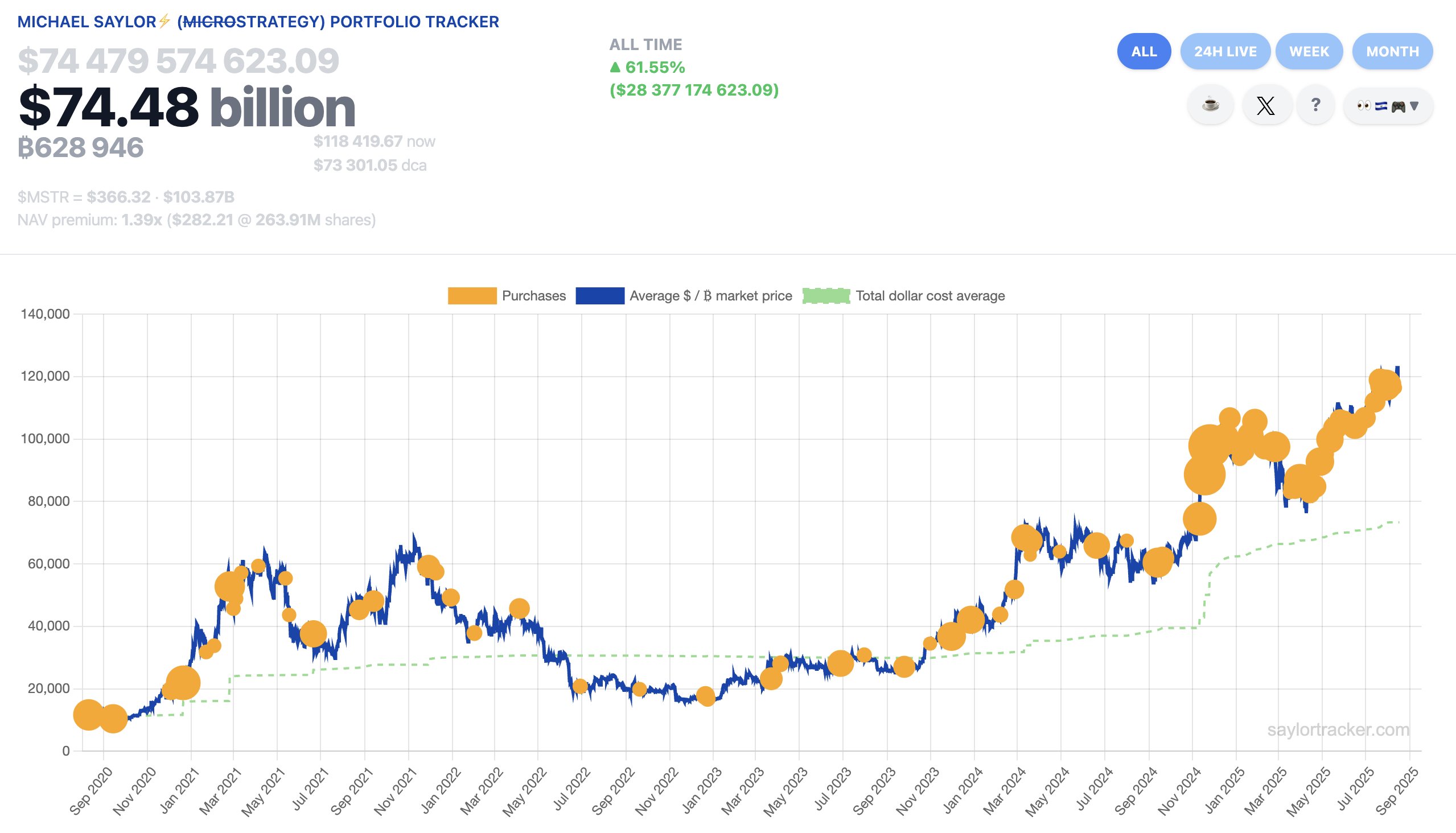 Five years after its first bitcoin purchase in 2020, Strategy now holds about $72.4 billion in BTC at current prices, acquired at an average $73,320 per coin for a total outlay of roughly $46.2 billion, including fees, co-founder and executive chairman Michael Saylor shared on Aug. 18. The stash leaves the company sitting on about $26.2 billion in paper gains.