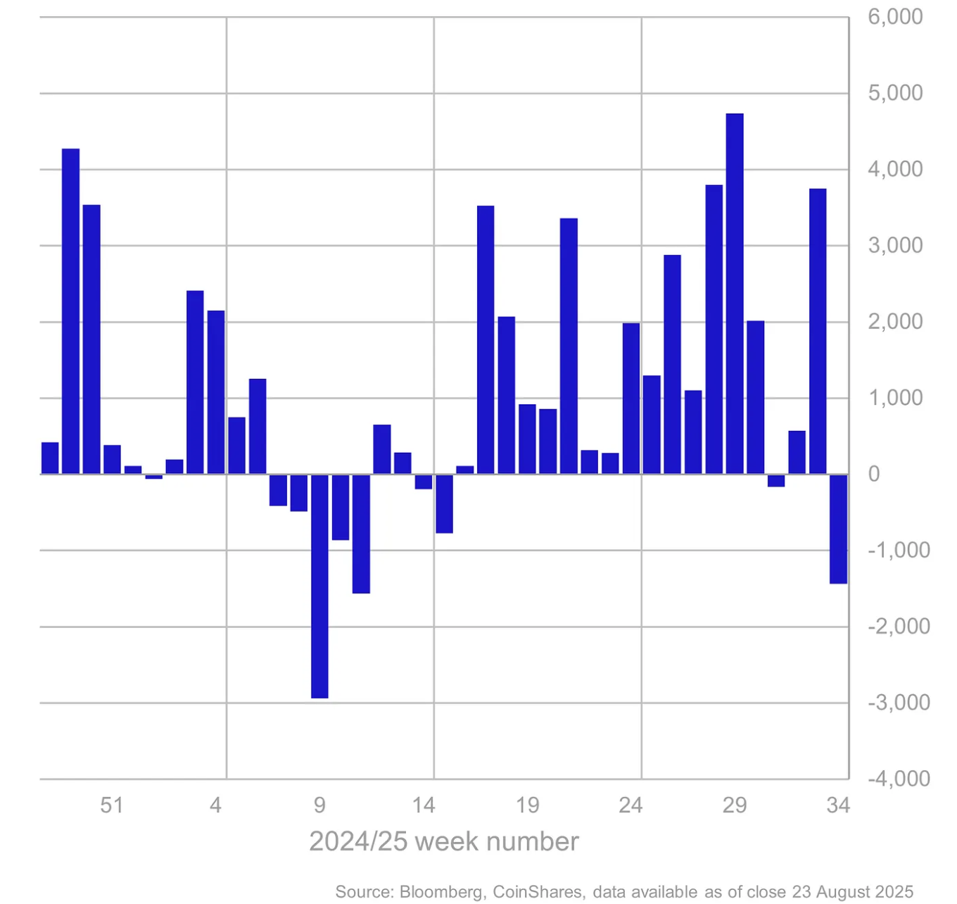James Butterfill, head of research at CoinShares, said flows were volatile through the week. After nearly $2 billion in early redemptions, capital movements stabilized and funds drew about $594 million of net inflows following Fed Chair Jerome Powell’s Jackson Hole remarks.