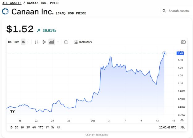 Canaan shares were trading at $1.53 at the time of publication, among their highest levels this year. However, earlier in October, the stock briefly touched $1.56 after the company announced a 50,000-unit order for its Avalon A15 Pro miners, its largest single sale in three years.