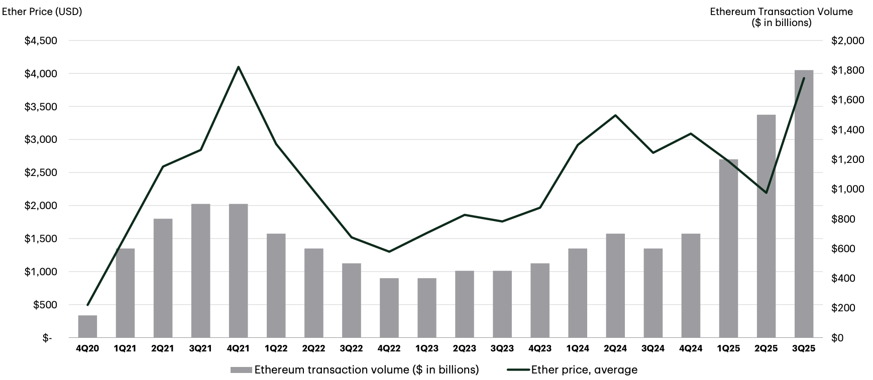 Ethereum Transaction Volume and Average Ether Price by Quarter, 4Q20 to 3Q25 | Images: TD Cowen