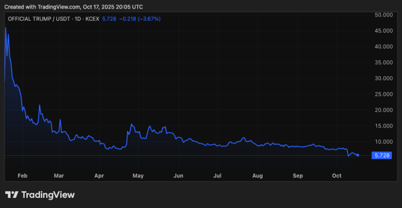 After making its debut the weekend before President Donald Trump's inauguration in January, the TRUMP token has been on a steady downward slide. It currently trades for around $5.73 with a market capitalization of $1.1 billion and a fully diluted valuation of $5.7 billion, according to The Block's data.
