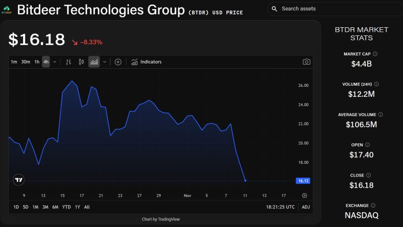 Shares of bitcoin miner Bitdeer Technologies Group (ticker BTDR) fell more than 30% this week, sliding from just over $23 on Monday morning to about $16 by Tuesday, according to The Block’s price page.